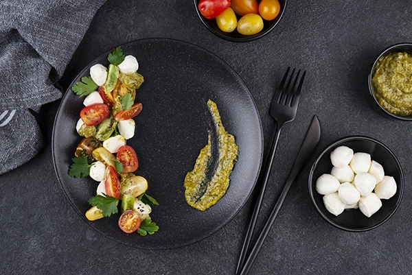 Sos śmietanowy ze szpinakiem i suszonymi pomidorami purée ziemniaczane/mix sałat.